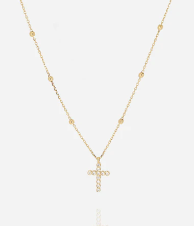 Collier en acier uni ou doré à l’or fin par ionisation serti d’une croix en zirconiums.